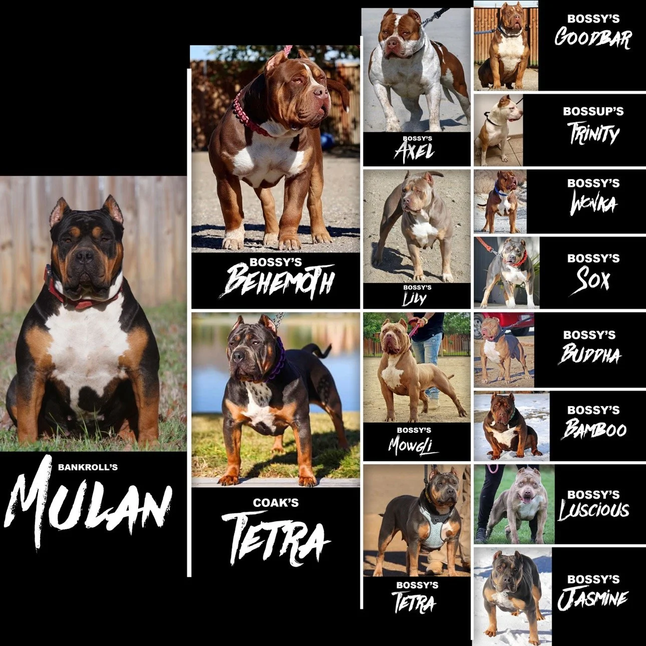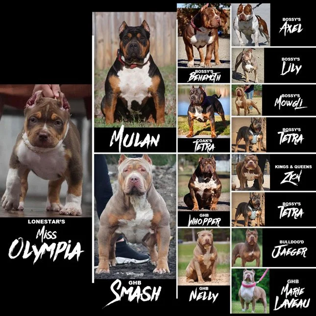 Our Females Lily Stats Weight: 118 LBS Height: 21.5” Color: Lilac Tri Pedigree: Zion X Tetra (Whooper Littermate) Mulan Stats Weight: 105 Height: 21.5 Color: Black Tri Pedigree: Behemoth X Tetra (Heirs Littermate) Athena Stats Weight: 90 Height: 20” Color: Black Pedigree: Mansa Musa X Zada Lonestar Bullies Canela Weight: Growing Height: Growing Color: Chocolate Pedigree: Enzo X Athena Co owned with born quality kennels Lonestar Bullies Miss Olympia Weight: Growing Height: Growing Color: Chocolate Ticked Trim Pedigree: Mulan X SmashCo owned with Mcglotlin Muscle Kennels